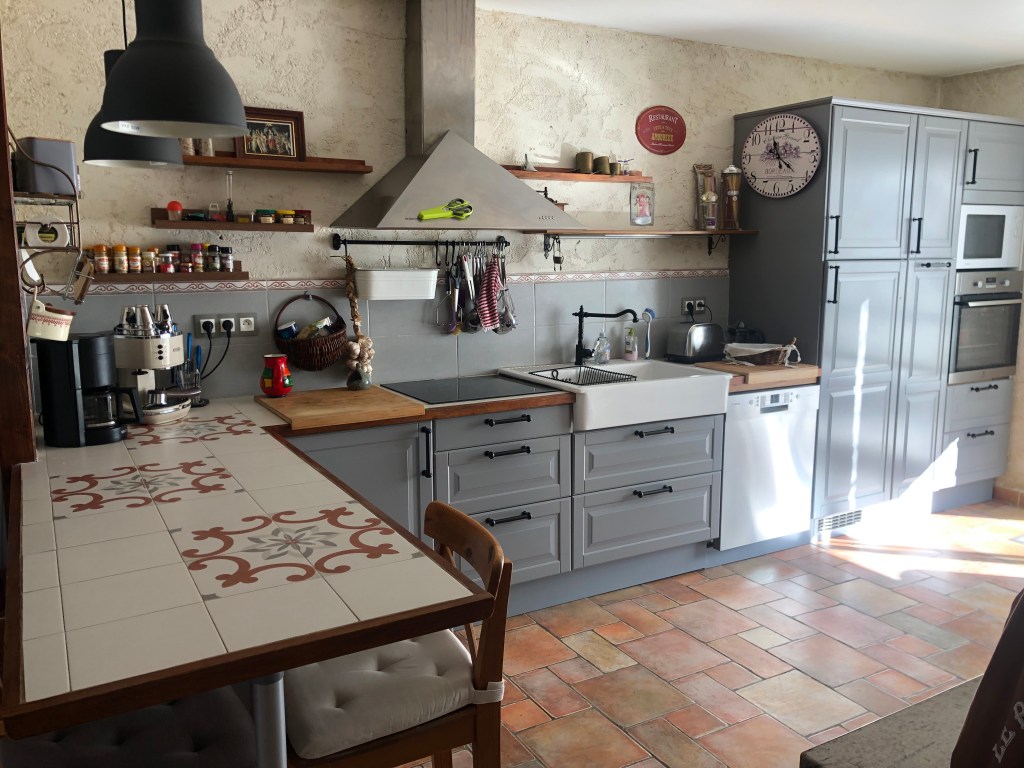 Cuisine entièrement intégrée et équipée, (frigo, congélateur, plaque induction, four, lave vaisselle, lave linge…,)